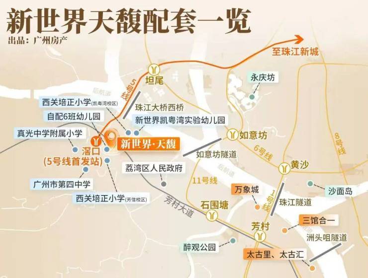 约200米到地铁5号线滘口站,一轨直达珠江新城。校园距小区仅200米左右,西关培正小学芳信校区本年开学,现在招生规模已划定。
