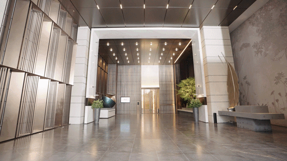 约10米挑高大堂,与绮丽酒店同款,金属格栅与大尺度仿石砖营建抑制而高档的归家典礼感。广州东塔同品牌高速电梯,超1秒1层,几乎是全广州最快的归家客梯。