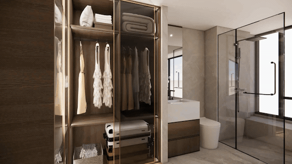 其主卧套房更是到达约21㎡,独立衣帽间沉着收纳女主人的当季新品,衣服包包首饰都能稳妥收纳。在这儿,用更少的面积,做到了130㎡以上户型才有的享用。