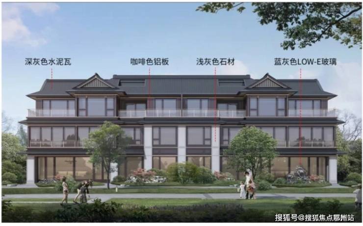 作用图上来看,外立面为新中式风格,由深灰色水泥瓦、咖啡色铝板、浅灰色石材、蓝灰色LOW-E玻璃组合而成。